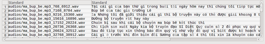 Do việc training text to speech sẽ phải tách dữ liệu thành từng cặp câu nhỏ nên các cháu cần phải cắt các cái file siêu to khổng lồ kia thành các file siêu bé tí hon nhé. Và chúng ta sẽ cần cắt theo thời gian bắt đầu và kết thúc trong file srt. Và do đã tách ra thành nhiều file nhỏ nên chúng ta cần lưu text tương ứng với filename trong một file csv. Output của chúng ta sẽ có dạng như sau các cháu nhé: