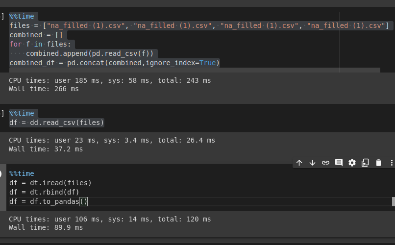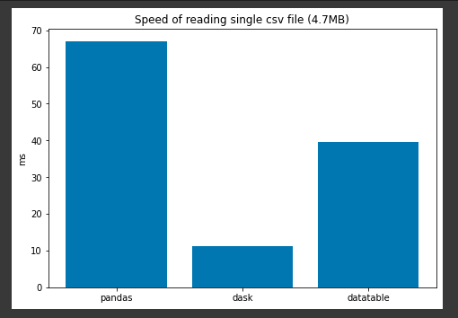 Nhìn vào 2 hình trên thì Dask vẫn nhanh nhất (như mình có nói ở trên đối với dữ liệu csv lớn thì Dask rất hiệu quả) , tuy nhiên khi chạy nhiều file thì Pandas lại đọc nhanh hơn datatable.