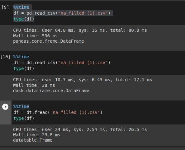 Kiểm tra thời gian đọc của pandas, dask và datatable