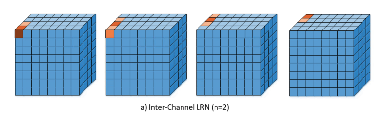 Có thể hình dung LRN giống như việc chuẩn hoá dựa trên các neuron "hàng xóm" tức thuộc cùng vị trí nhưng ở các kernel lân cận. Chúng ta cso thể hình dung nó trong hình sau