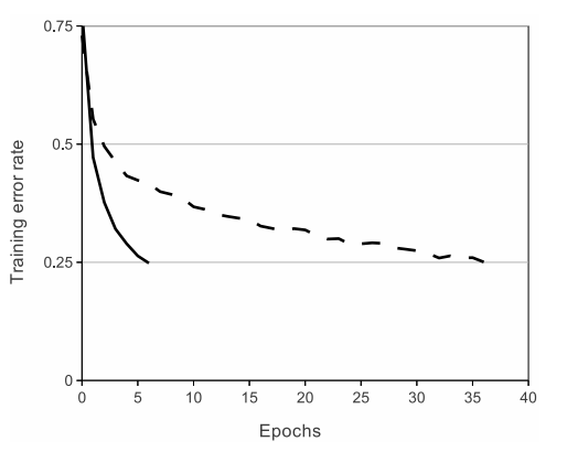 Tron đó đường nét liền chính là thời gian training khi sử dụng ReLU, nét đứt chính là thời gian training khi sử dụng hàm tanh. Dễ thấy sử dụng ReLU sẽ cho tốc độ hội tụ nhanh gấp khoảng 6 lần khi sử dụng activation tanh với cùng 1 kiến trúc mạng.