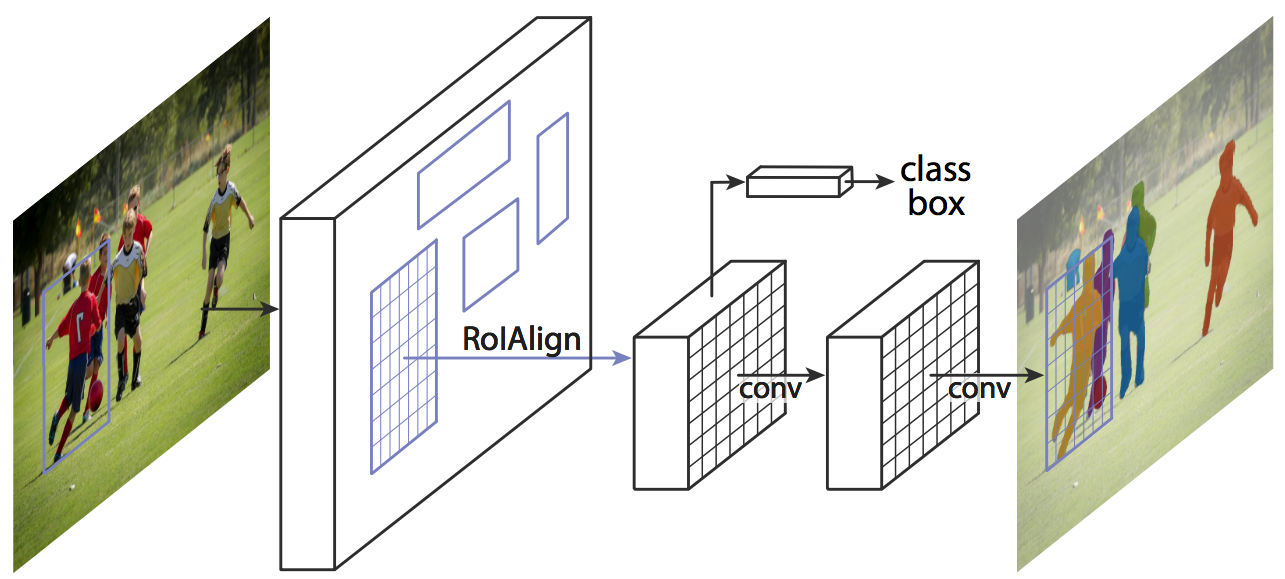 Hầu hết các phương pháp Instance Segment đang được sử dụng phổ biến hiện nay được xây dựng dựa trên các two-stage detector. Để dễ phân biệt, two-stage detector phổ biến là Fast RCNN, Faster RCNN; còn single-stage hay one-stage detector phổ biến là Yolo, SSD, Restina . Điển hình cho hướng đi two-stage based là Mask RCNN - hiện nay đang được sử dụng rất phổ biến trong cộng đồng bởi độ chính xác cao. Hãy quan sát hình dưới đây để hiểu rõ hơn về Mask RCNN. Tuy có độ chính xác cao nhưng nó vẫn có nhược điểm:
