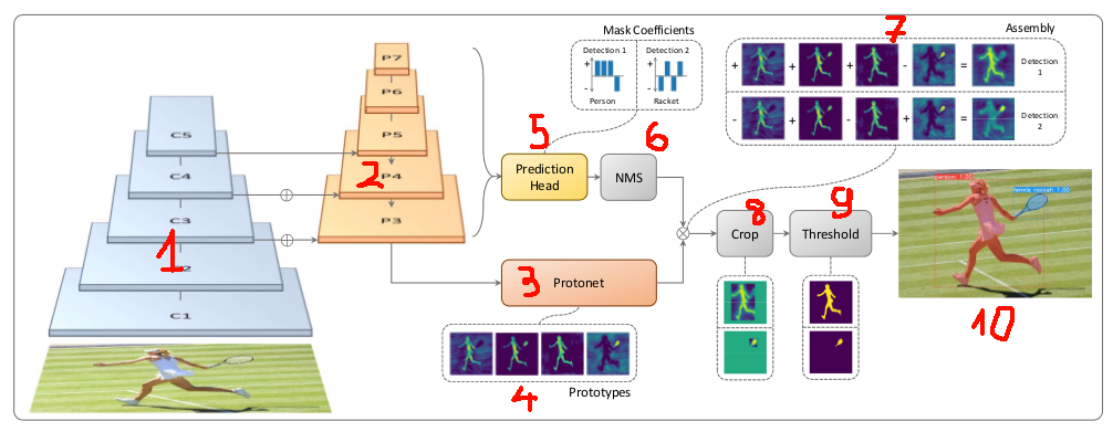 Prototype net là 1 mạng FCN (Fully Convolution), trả về output là các Prototype Mask (phần 4). Các prototype mask này được coi là các thành phần cơ bản, khi kết hợp với các tỷ lệ khác nhau sẽ cho ra các mask tương ứng cho từng đối tượng. Để dễ hiểu, bạn hãy nghĩ prototype mask giống như 1 tập nguyên liệu: rau muống, tỏi, mắm, muối, nước lọc ... Khi kết hợp (chế biến) các nguyên liệu này với tỷ lệ thích hợp, kết quả mong muốn là đĩa rau muống xào - là phần 10 trong ảnh.