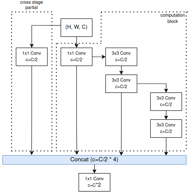 CSP-OSA là một tên gọi do mình tự chế vì mình thấy nó giống OSA module được CSP hóa. OSA module bắt nguồn từ VoVNet, là một module cực kì nhanh và tiết kiệm điện năng. CSP-OSA module có kiến trúc ở Hình 7.