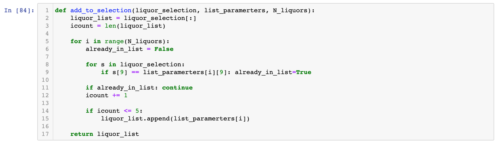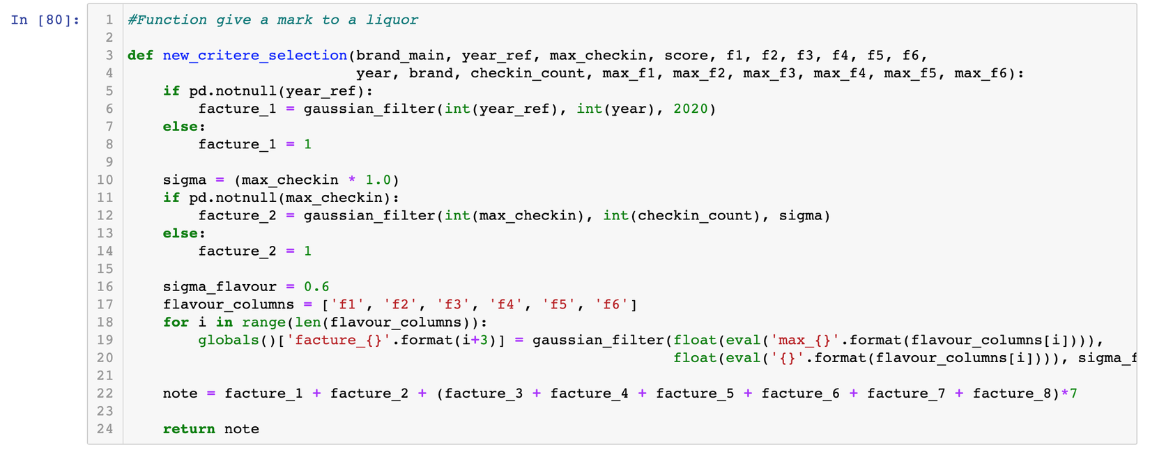 Sau khi có được Top N các phần tử giống nhau, nhiệm vụ tiếp theo của chúng ta cần làm là chọn ra 5 phần tử có chỉ số f1-f6 gần giống với liquor entry nhất. Nói đến đây cách đơn giản nhất mà mọi người thường nghĩ ngay đến là so sánh khoảng cách vector giữa các phần tử này, tuy nhiên đó không phải là 1 ý tưởng hay, tại vì sao. Có những kết quả được trả về bằng nhau giữa tổng bình phương hiệu các phần tử của 2 vecto nhưng vì nó có sự bù trừ giữa các chỉ số => có những phần tử bị sai lệch quá nhiều về 1 hoặc 2 chỉ số trong f1- f6 => cách hợp lý hơn cả là dùng 1 công thức tính weight để so sánh về mức độ tương đồng giữa các chỉ số f1 - f6.