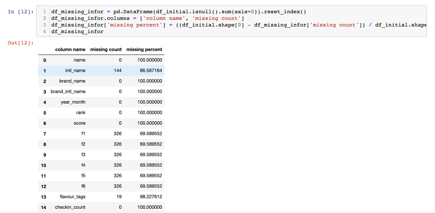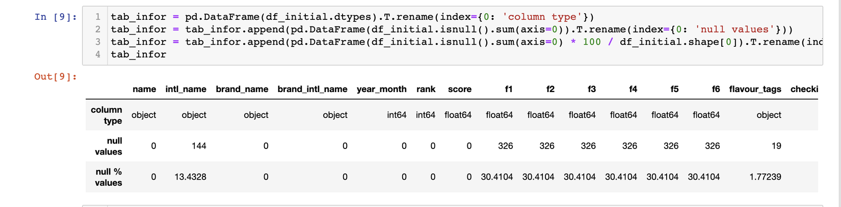 Chúng ta có khoảng hơn 1k bản ghi, nhưng f1-f6 và flavour_tags lại đang bị null đến hơn 30%, cách giải quyết sẽ là như thế nào, nếu bỏ qua tất cả những bản ghi này thì thật sự sẽ rất lãng phí. Qua quá trình quan sát, tớ nhận thấy những field nào có flavour_tags có phần giống nhau sẽ có xu hướng f1-f6 tương tự nhau, vì vậy chắc chắn chúng có mối quan hệ gì rồi. Chúng ta sẽ nói đến việc xử lý với chỗ dữ liệu null này như thế nào ở phần tiếp theo nhé.