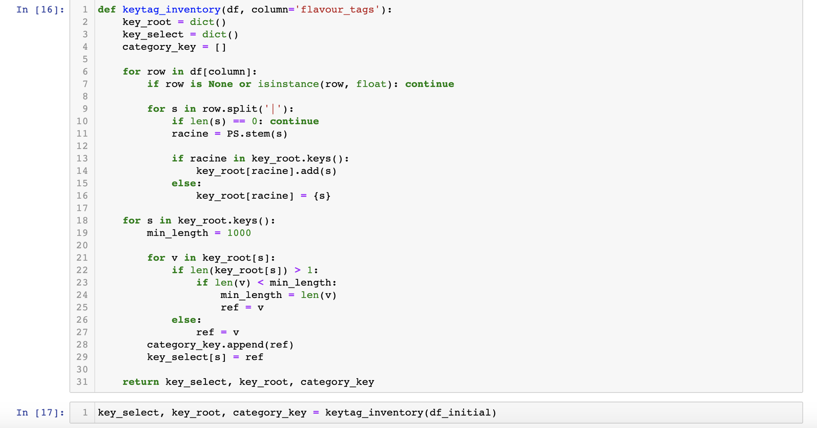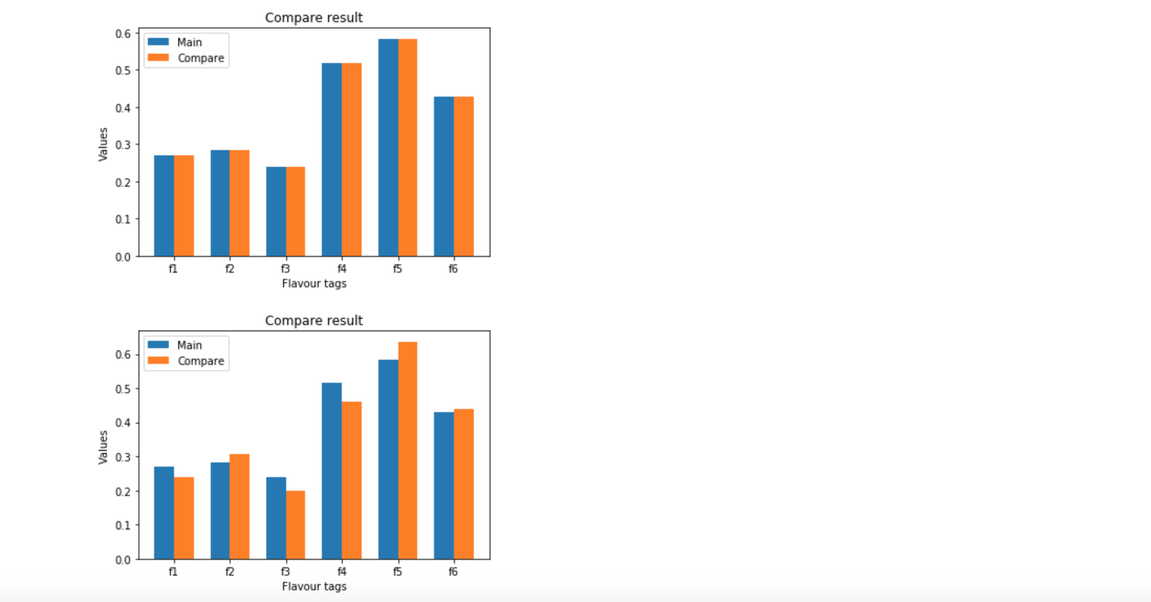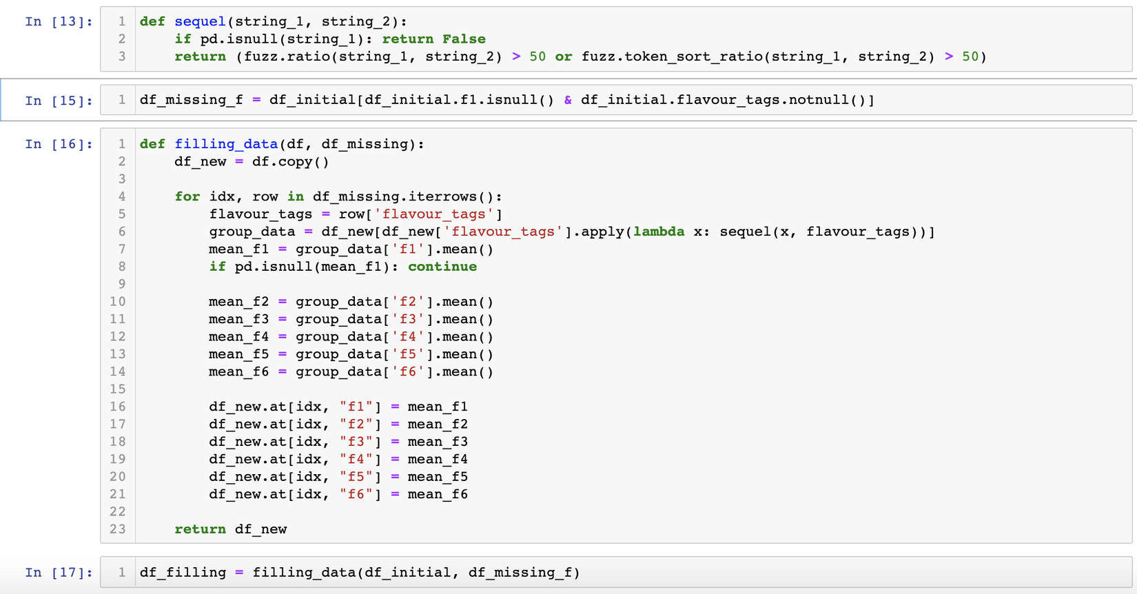 Phần cuối cùng của phần data preprocessing này, tớ muốn đề cập là missing data filling. Như đã đề cập phần này từ trước, có đến hơn 30% là giá trị null của f1-f6 hoặc flavour_tags hoặc là cả 2, nếu không tận dụng thì sẽ rất phí. Qua quan sát tớ nhận ra những sản phẩm có phần giống nhau về tags sẽ có các dải giá trị f1-f6 khá tương tự nhau, nên t quyết định query ra những sản phẩm có flavour_tags nhưng bị null f1-f6, lặp từng sản phẩm này và lấy ra những sản phẩm có flavour_tags giống > 50% với flavour_tags của sản phẩm này, gom nhóm lại rồi lấy mean từng giá trị f1-f6. Hãy xem đoạn code sau nhé: