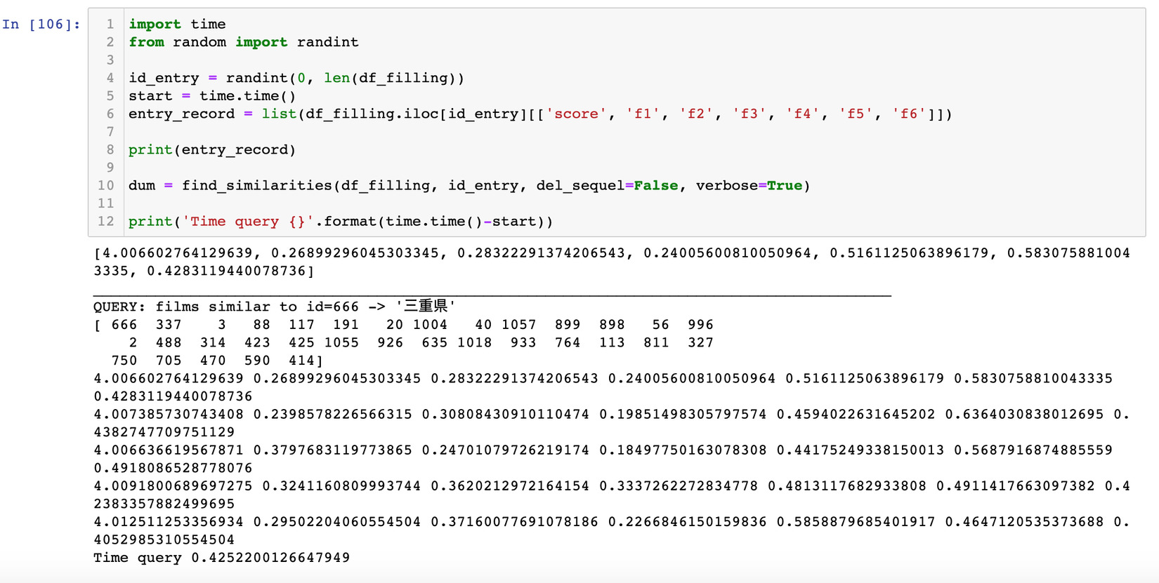 Ở đoạn code trên đây, t append thêm vào Dataframe input một matrix chỉ bao gồm 1 trong 2 giá trị là 0 hoặc 1, sau đó tớ đưa matrix này như là 1 tập data đưa vào KNN để train, mục đích dùng KNN là để tìm ra top N các vector giống nhất với vector đầu vào.