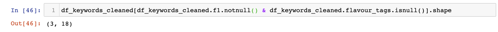 Tiếp đến có 2 case cần quan tâm là những bản ghi null cả flavour_tags và f1-f6, case này tớ bỏ luôn vì không có một mối liên hệ nào cả. Trường hợp f1-f6 có data nhưng flavour_tags null thì sao, chúng ta phải check thử mới biết được