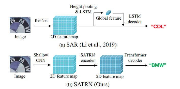 Mạng SATR tối ưu cơ chế self-attention với mục đích thu được các feature về không gian, 2D feature map ảnh text scene. Lấy ý tưởng trên mô hình Transformer, kiến trúc rất nổ trong các bài toán NLP và CV gần đây. Phương pháp của tác giả cũng bao gồm kiến trúc encoder-decoder nhằm giải quyết vấn đề representation giữa ảnh và text.