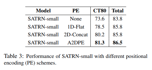So sánh mô hình với các lớp PE khác nhau trên tập CUTE80 (tập dữ liệu chứa nhiều ảnh text cong và hình dạng phức tạp), kết quả cho thấy A2DPE có độ chính xác cao nhất trong 4 lựa chọn.