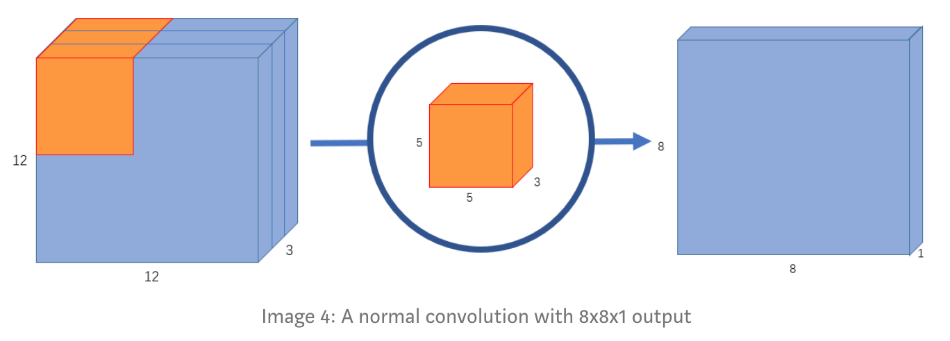 Ý tưởng tương tự với spatial separable convolution, depthwise separable convolutions chia 1 kernel thành 2 kernel riêng biệt là depthwise convolution và pointwise convolution để thực hiện 2 convolution. Trước khi chúng ta đi chi tiết hơn về cái cách mà depthwise và pointwise convolution thực hiện, hãy cùng xem lại cách mà convolution thông thường hoạt động như thế nào.