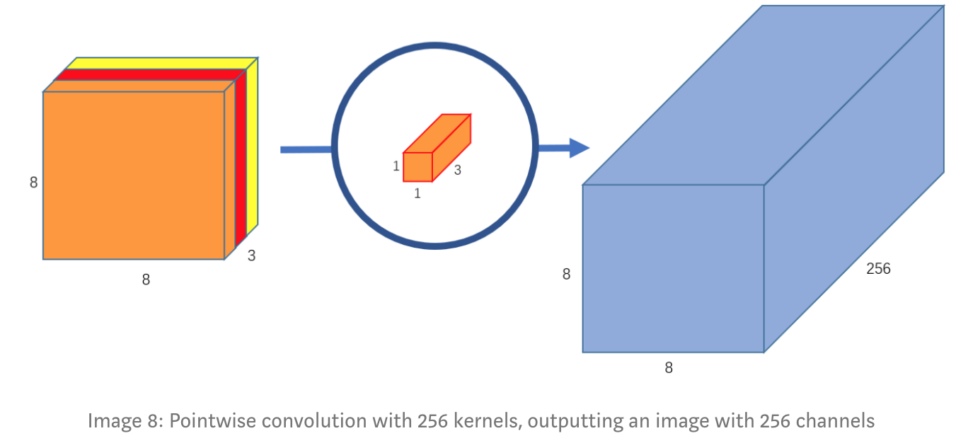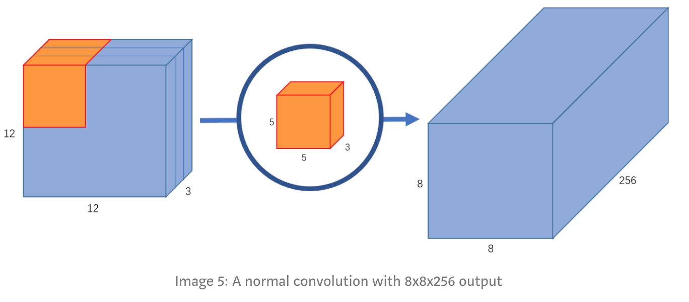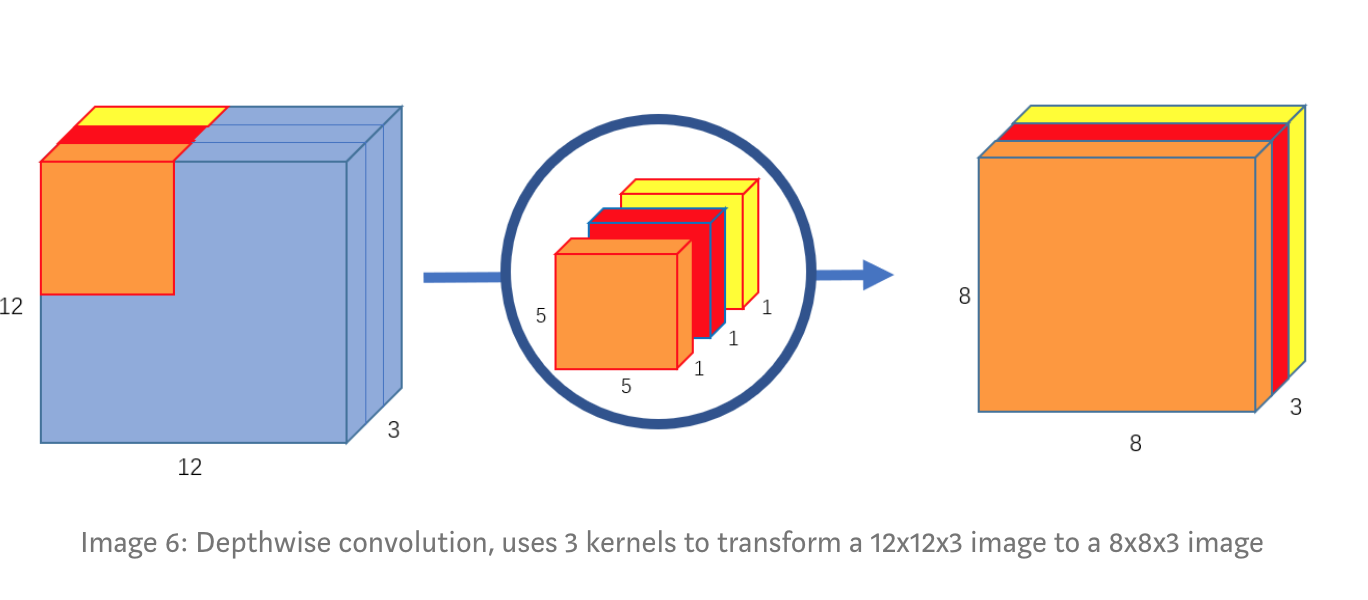 12x12x3 — (5x5x3x256) — > 8x8x256. Tiếp theo chúng ta sẽ nói đến depthwise convolution và pointwise convolution.