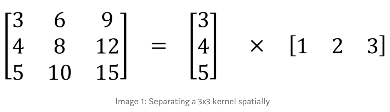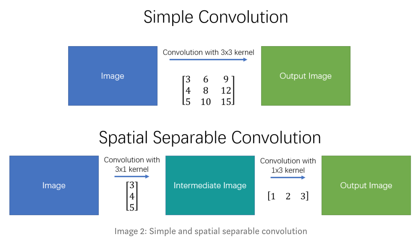 Ở đây, thay vì thực hiện 1 convolution với 9 phép nhân thì nó chỉ dùng 3 phép nhân cho mỗi kernel nhỏ nghĩa là 6 phép nhân tất cả để đặt được kết quả tương tự như với convolution thông thường. Như vậy, khi số lượng các phép nhân giảm đi, độ phức tạp tính toán cũng giảm xuống và mô hình của chúng ta cũng run nhanh hơn.