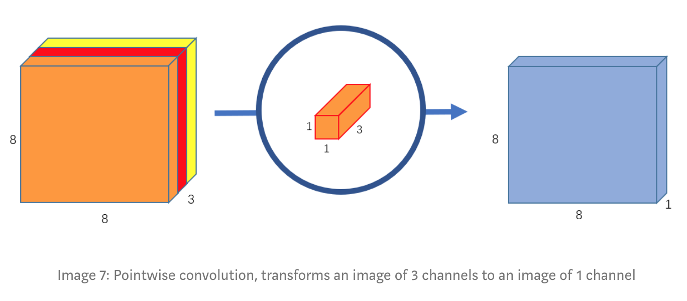 Thì đây sẽ là nhiệm vụ của pointwise convolution, nó được đặt tên như vậy là bởi vì nó sử dụng các kernel 1x1 để thực hiện phép convolution với từng điểm dữ liệu. Kernel sẽ có số lượng channels bằng với số lượng channels của ảnh đầu vào với mục đích để thu được 1 channel của ảnh đầu ra. Ở đây, kernel của chúng ta sẽ là 1x1x3, sau khi convolution ảnh 8x8x3 — (1x1x3) — > 8x8x1.