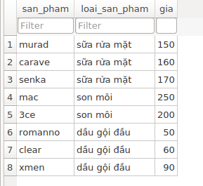 Để đơn giản cho việc quản lý sản phẩm cũng như dễ dàng cập nhật sản phẩm mới mình nghĩ các bạn nên tạo database cho bản phẩm để và dưới đây mình đã tạo sẵn một database ví dụ về sản phẩm và các bạn có thể thêm các trường thông tin cũng như nội dung mà mình mong muốn. Để tạo database này mình có sử dụng SQLITE3 python và dưới đây là database mình tạo bao gồm 3 loại sản phẩm bao gồm : sữa rửa mặt, son, dầu gội đầu và tên các sản phẩm và giá kèm theo.