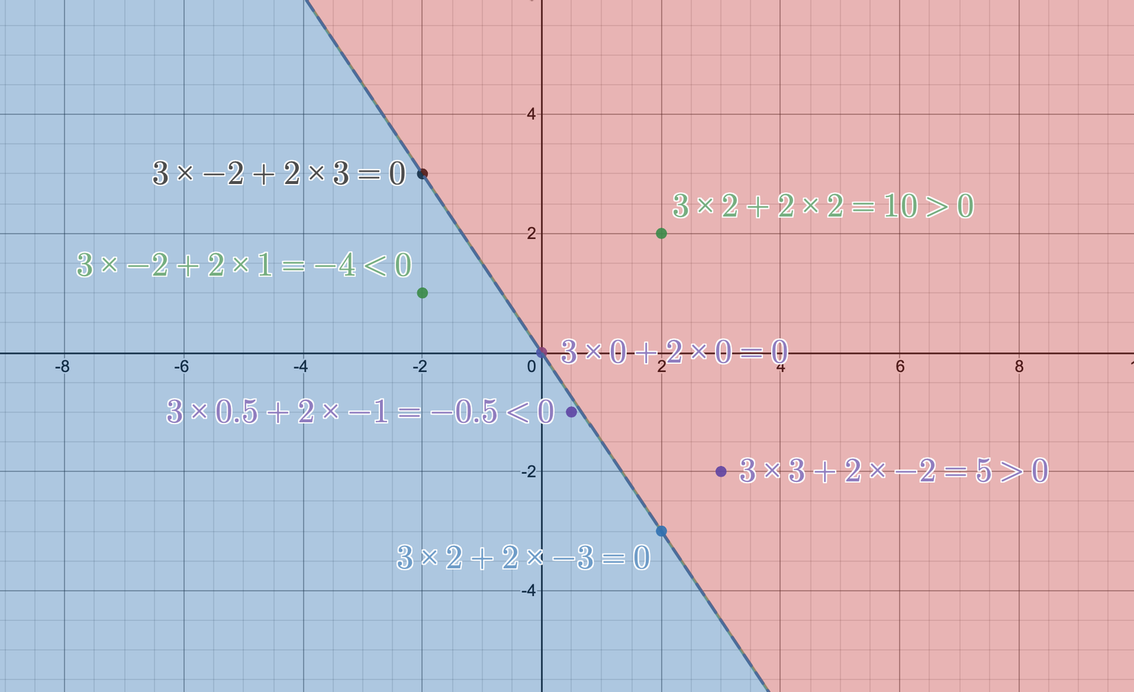 Như chúng ta có thể thấy, đường thẳng đó chia mặt phẳng thành 2 phần: các điểm nằm ở nửa màu đỏ sẽ có tính chất , các điểm nằm ở nửa màu xanh sẽ có tính chất , và các điểm nằm trên đường thẳng thì, như các bạn chắc cũng đoán được, .