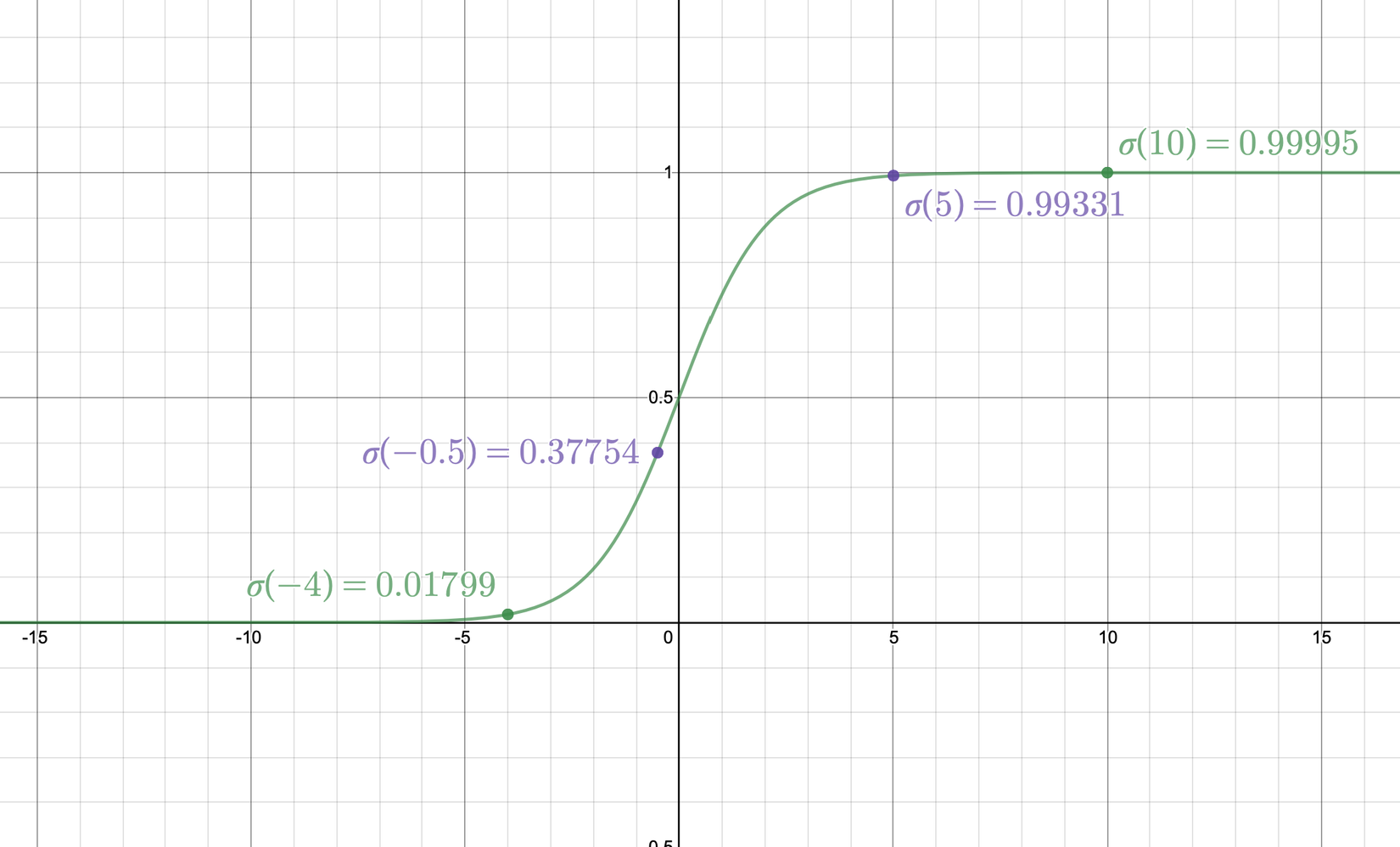 Để ý kỹ hơn tí nữa, bạn sẽ nhận ra: sau khi được "kích hoạt," hàm sigmoid sẽ lớn hơn 0.5 với các giá trị đầu vào lớn hơn 0, và bé hơn 0.5 với các giá trị đầu vào nhỏ hơn 0.5. Giá trị càng lớn thì sau sigmoid càng gần 1, và càng bé thì sau sigmoid càng gần 0. Biểu đồ của hàm sigmoid nhìn như sau: