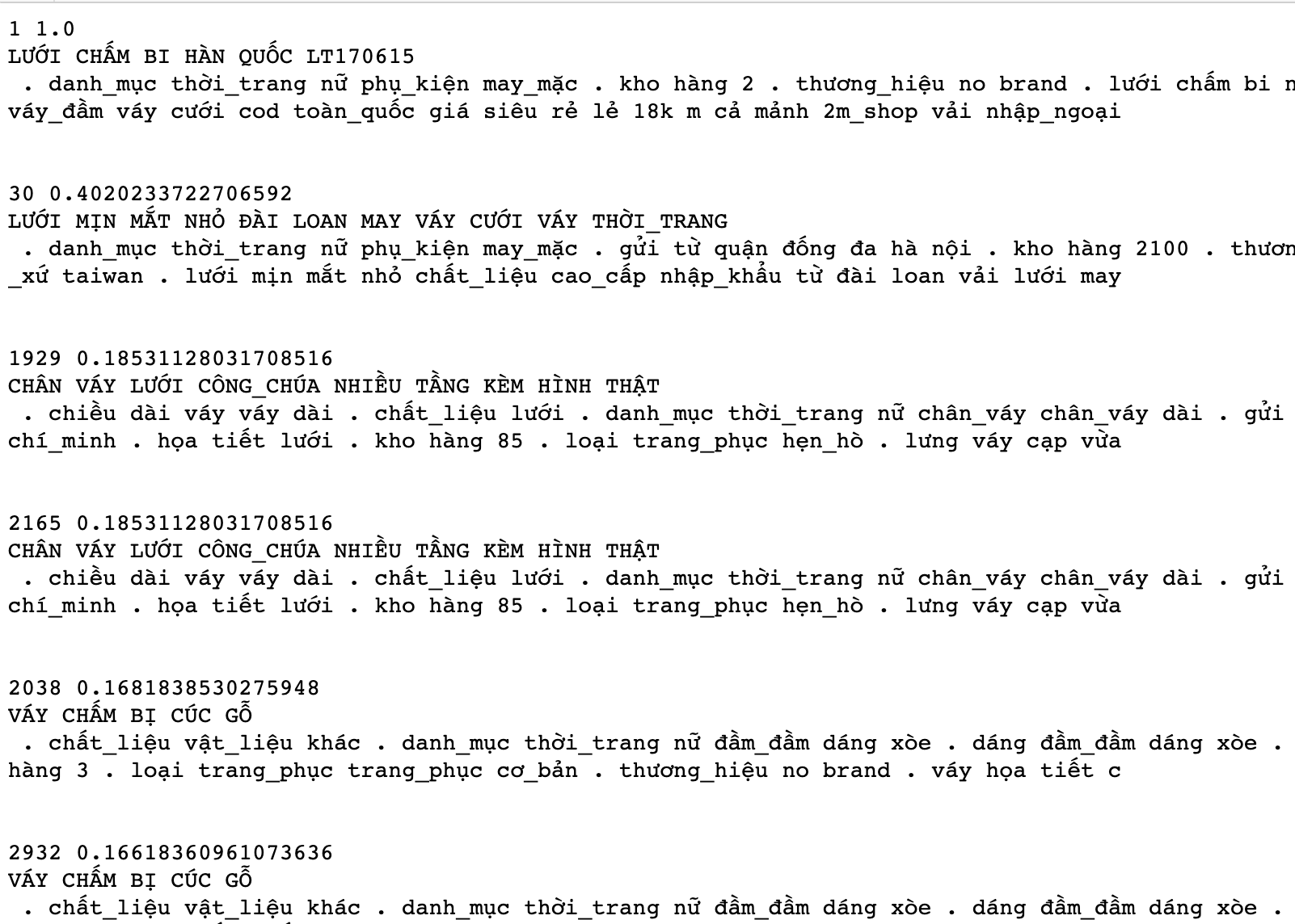 Sản phẩm đầu tiên chính là sản phẩm được lấy làm query_vector nên là sản phẩm đúng nhất. Ta có thể thấy, trong hàng ngàn sản phẩm đủ mọi mặt hàng nhưng các kết quả trả về đều liên quan tới sản phẩm đầu tiên. Kết qủa trông rất khả quan, đều liên quan tới mặt hàng "váy lưới chấm bi Hàn Quốc"