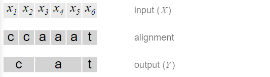 Ở ví dụ dưới, đầu vào của chúng ta (tức output của RNN) có độ dài 6 (6 time step). Y của chúng ta có độ dài 3, Y = [c,a,t]. Một cách đơn giản, ta có thể align X và Y như sau: