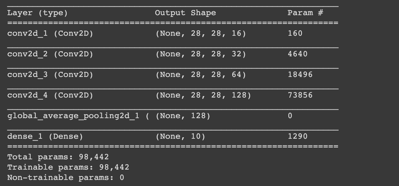 Nhìn khá đơn giản phải không chỉ có hơn 98k params, 4 lớp conv 2d đi qua GAP cuối cùng là 1 lớp Dense, nhiều bạn sẽ hỏi là sao ko có lớp max pooling nào, đơn giản là vì mỗi lần qua 1 lớp MP thì thông tin không gian sẽ bị mất cho nên mình đã loại bỏ nó, nhưng như thế đồng nghĩ với việc mạng sẽ train mất thời gian hơn