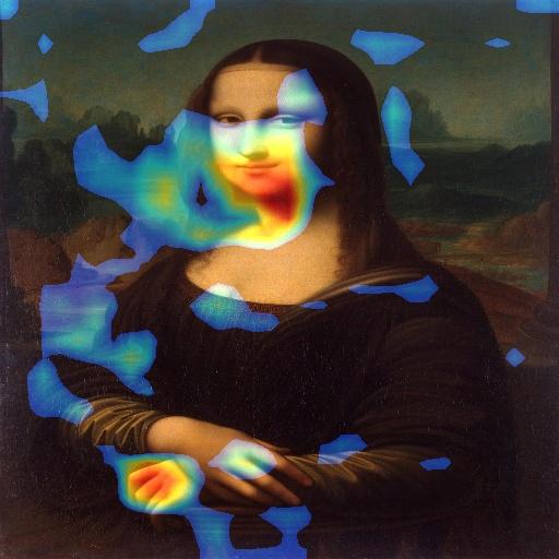 Bản đồ kích hoạt lớp là một kỹ thuật đơn giản để tìm thấy những vùng đặc biệt trên bức ảnh liên quan đến class ta cần xác định. Nói cách khác, CAM(bản đồ kích hoạt lớp) sẽ show cho ta vùng nhiệt có liên quan đến class này, giống như Như bức tranh Mona Lisa ở dưới(các vùng nhiệt đang cố gắng dự đoán và khoanh vùng những đặc điểm về người trên bức tranh) :