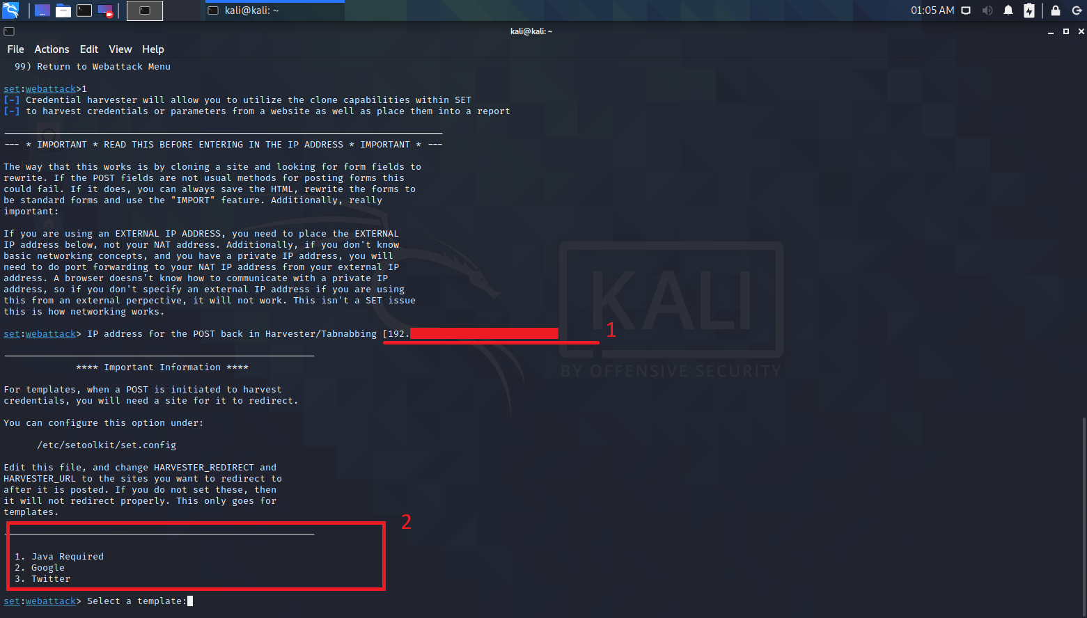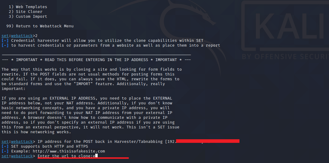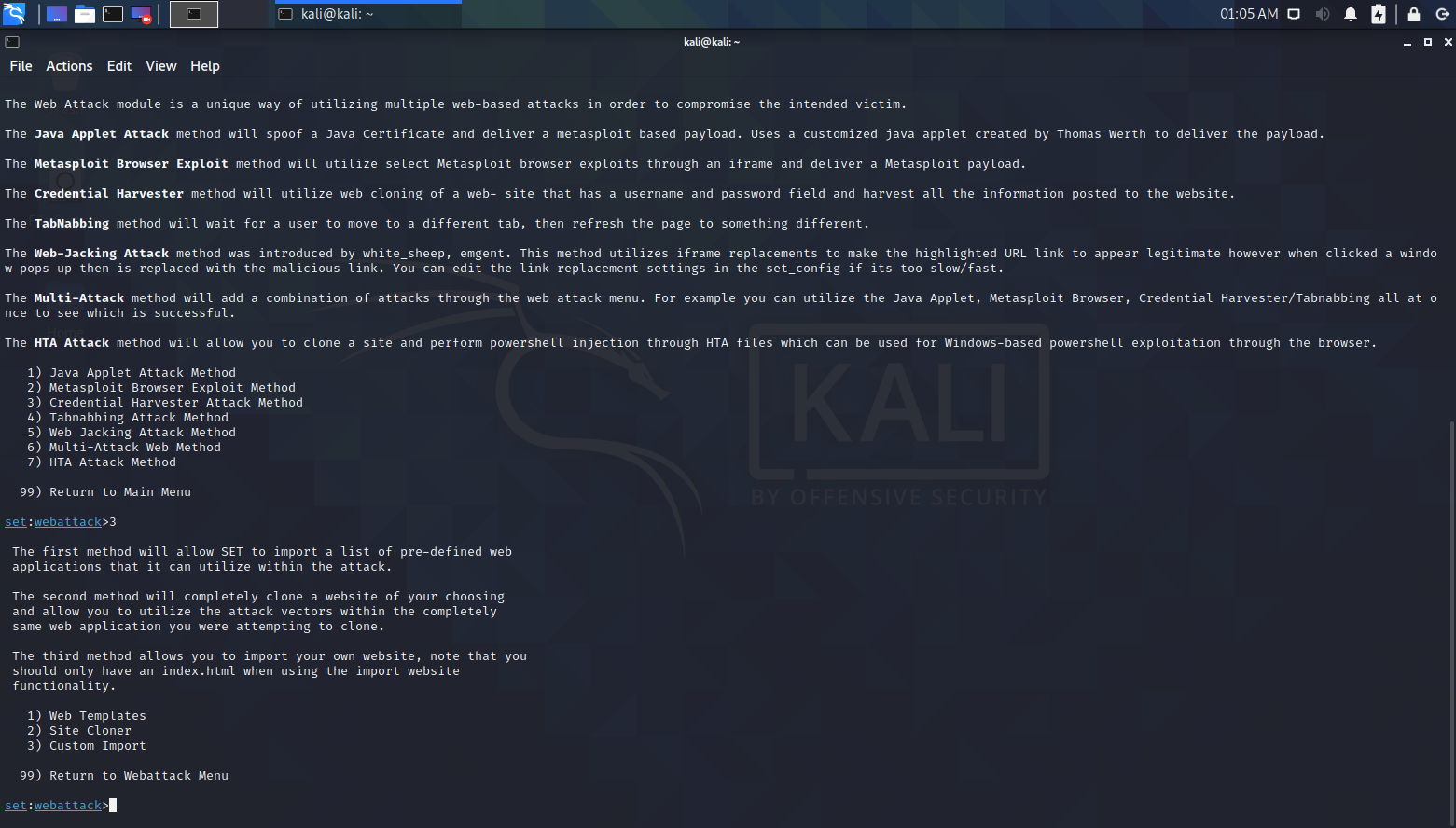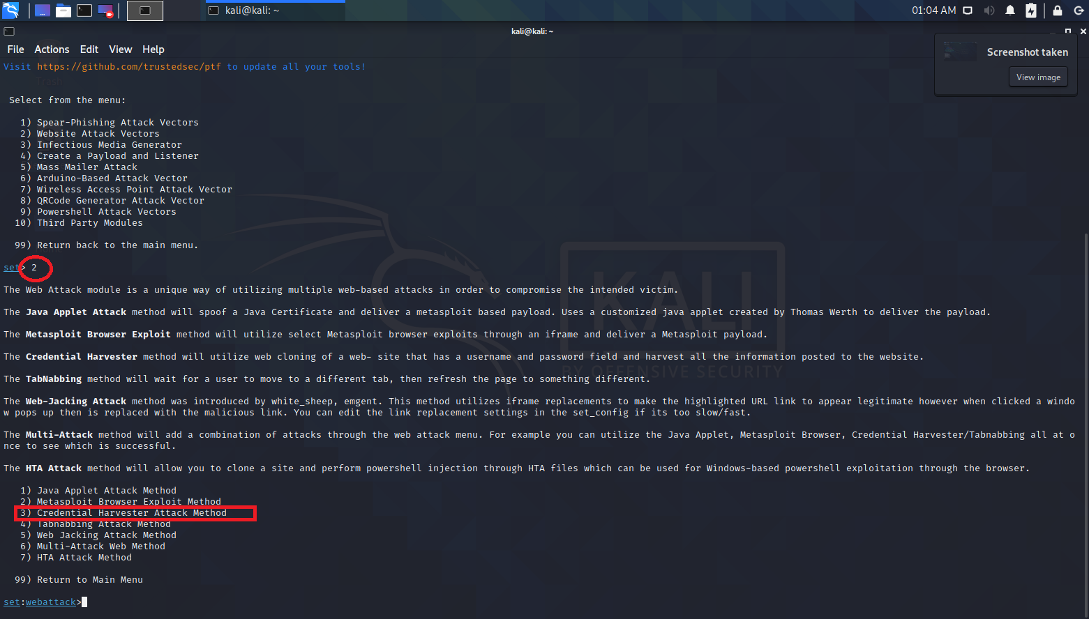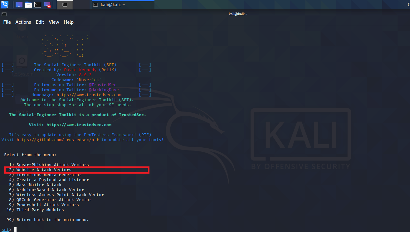 Tấn công web: Mô-đun này kết hợp các tùy chọn khác nhau để tấn công nạn nhân của bạn từ xa. Nó bao gồm các kỹ thuật tấn công như Java Applet Attack và Metasploit Browser Exploit để cung cấp các payload độc hại. Phương pháp Credential Harvester cho phép bạn sao chép trang web và thu thập thông tin từ các trường người dùng và mật khẩu, cũng như các kỹ thuật TabNabbing, HTA Attack, Web-Jacking và Multi-Attack, tất cả đều có cùng mục đích là phishing nhằm lừa người dùng tiết lộ thông tin đăng nhập của họ.