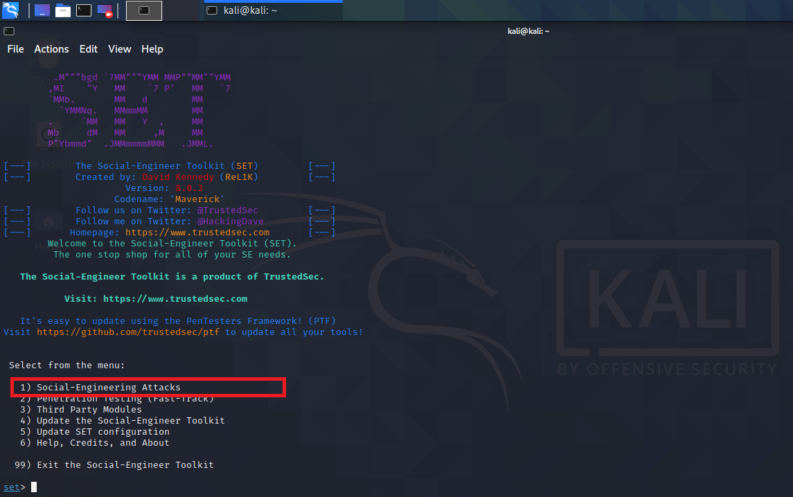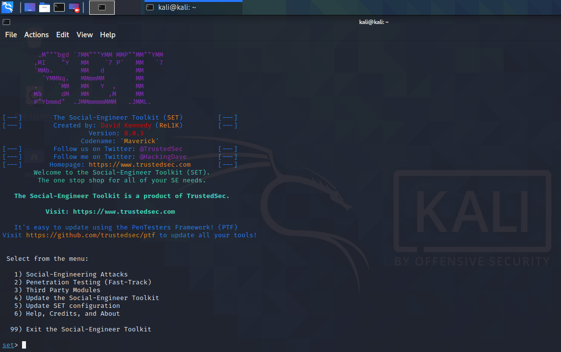 Hiện tại thì SEToolkit đã được tích hợp sẵn trong bản cài đặt Kali Linux mới nhất. Nên với những ai đang sử dụng Kali linux thì tại Terminal ta chỉ cần gõ lệnh setoolkit là truy cập được.