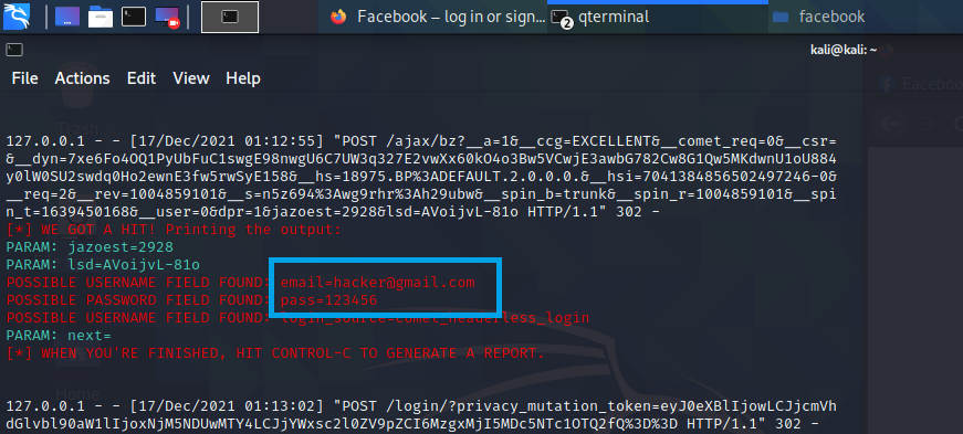 Khi người dùng truy cập vào url trên và nhập thông tin vào trang facebook giả này thì request sẽ được chuyển về cho SET. Giao diện SET lúc này sẽ như sau:
