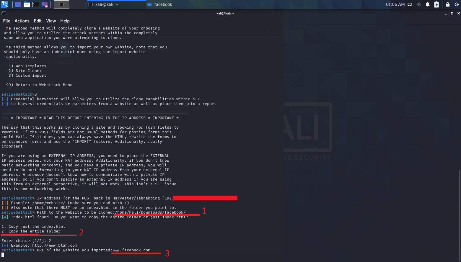 Tiếp theo nhập địa chỉ đường dẫn vừa lưu tệp index.html, nhớ thêm / ở sau đường dẫn. Và cuối cùng là nhập url trang web bạn muốn phishing. Các bước được thực hiện như ảnh sau: