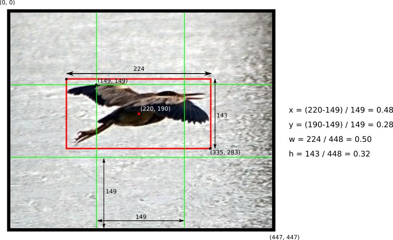 Localization loss là hàm lỗi dùng để tính giá trị lỗi cho boundary box được dự đoán bao gồm tọa độ tâm, chiều rộng, chiều cao của so với vị trí thực tế từ dữ liệu huấn luyện của mô hình. Lưu ý rằng chúng ta không nên tính giá trị hàm lỗi này trực tiếp từ kích thức ảnh thực tế mà cần phải chuẩn hóa về  [0, 1] so với tâm của bounding box. Việc chuẩn hóa này kích thước này giúp cho mô hình dự đoán nhanh hơn và chính xác hơn so với để giá trị mặc định của ảnh. Hãy cùng xem một ví dụ: