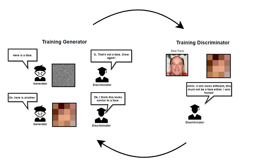 Sau đó, ta chuyển sang train generator. Mạng generator sẽ học cách sinh ra ảnh với chất lượng cao hơn nhờ vào phản hồi từ discriminator (ảnh do nó sinh ra được dự đoán là thật hay giả) cho tới khi discriminator không phân biệt được giữa ảnh thật và giả nữa. Tiếp theo ta lại chuyển qua train discrminator và quy trình cứ tiếp tục như vậy cho tới khi generator có thể sinh ra ảnh rất gần với ảnh trong bộ dữ liệu.