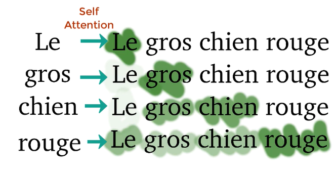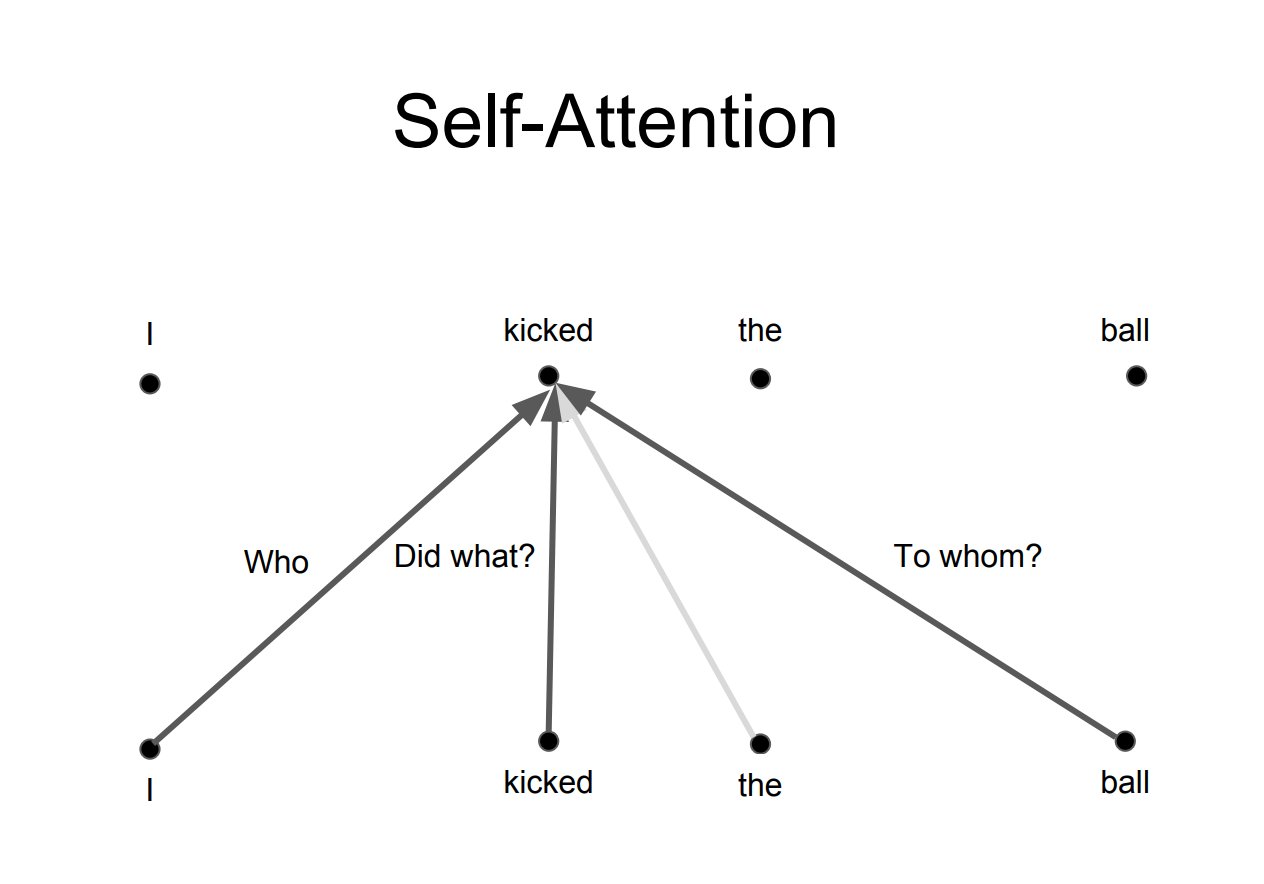 Self-Attention là cơ chế giúp Transformers "hiểu" được sự liên quan giữa các từ trong một câu. Ví dụ như từ "kicked" trong câu "I kicked the ball" (tôi đã đá quả bóng) liên quan như thế nào đến các từ khác? Rõ ràng nó liên quan mật thiết đến từ "I" (chủ ngữ), "kicked" là chính nó lên sẽ luôn "liên quan mạnh" và "ball" (vị ngữ). Ngoài ra từ "the" là giới từ nên sự liên kết với từ "kicked" gần như không có. Vậy Self-Attention trích xuất những sự "liên quan" này như thế nào?