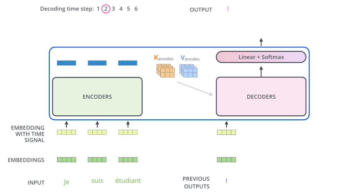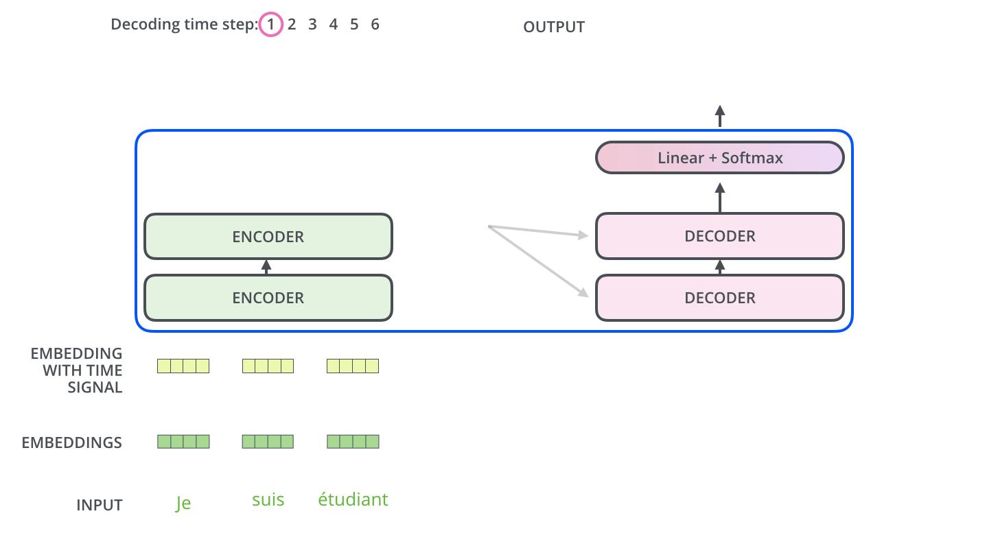 Quá trình decode về cơ bản là giống với encode, chỉ khác là Decoder decode từng từ một và input của Decoder (câu tiếng Pháp) bị masked. Sau khi masked input đưa qua sub-layer #1 của Decoder, nó sẽ không nhân với 3 ma trận trọng số để tạo ra Q, K, V nữa mà chỉ nhân với 1 ma trận trọng số WQ. K và V được lấy từ Encoder cùng với Q từ Masked multi-head attention đưa vào sub-layer #2 và #3 tương tự như Encoder. Cuối cùng, các vector được đẩy vào lớp Linear (là 1 mạng Fully Connected) theo sau bới Softmax để cho ra xác suất của từ tiếp theo.