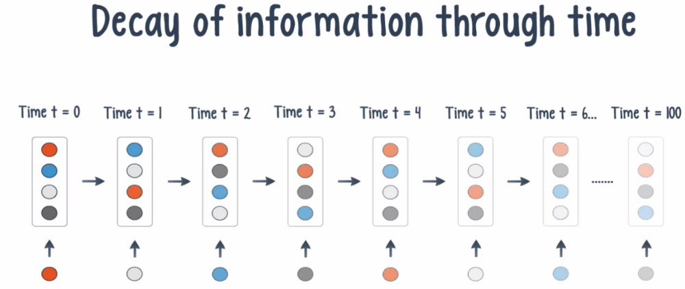 Điểm yếu thứ hai là nó xử lý không tốt với những câu dài do hiện tượng Gradient Vanishing/Exploding. Khi số lượng units càng lớn, gradient giảm dần ở các units cuối do công thức Đạo hàm chuỗi, dẫn đến mất thông tin/sự phụ thuộc xa giữa các units.