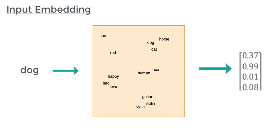 Máy tính không hiểu câu chữ mà chỉ đọc được số, vector, ma trận; vì vậy ta phải biểu diễn câu chữ dưới dạng vector, gọi là input embedding. Điều này đảm bảo các từ gần nghĩa có vector gần giống nhau. Hiện đã có khá nhiều pretrained word embeddings như GloVe, Fasttext, gensim Word2Vec,... cho bạn lựa chọn.
