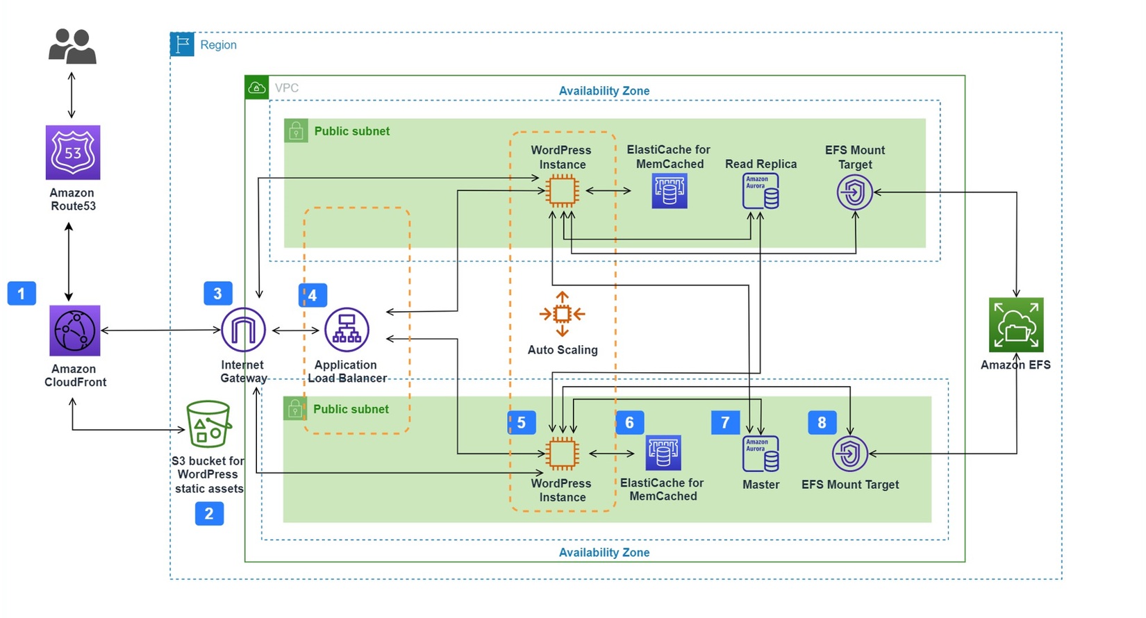 * Application layer : EC2, EFS, AutoScaling Group, Application Load Balancer, ElastiCache Memcached, S3, Cloudfront,...