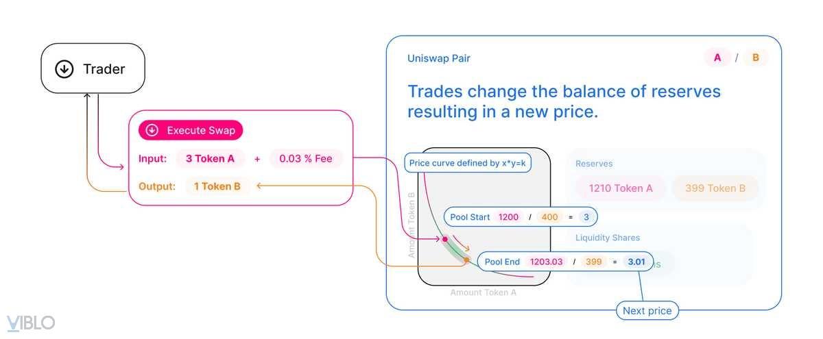 Trong các pool của Uniswap luôn tồn tại một công thức là: x * y = k