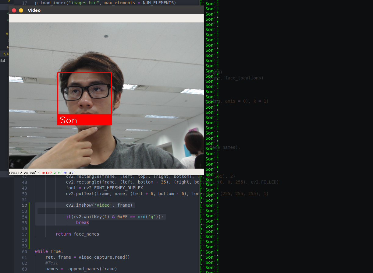 rgb_small_frame = small_frame[:, :, ::-1]Chuyển về kênh màu RGBface_locations = face_recognition.face_locations(rgb_small_frame)Trả về tọa độ của face có trong frameface_encodings = face_recognition.face_encodings(rgb_small_frame, face_locations)Kết hợp giữa cut face từ frame với tọa độ cho trước và encode nó ra thành vector 128 chiềulabels, distances = p.knn_query(np.expand_dims(face_encoding, axis = 0), k = 1)Với face_encoding vừa lấy ra được từ frame ta sẽ thực hiện query nó trong DBif distances < 0.13:Nếu euclidean distance của face vừa trích xuất ra với face trong DB mà nhỏ hơn 0.13 thì xuất ra tên đã tìm được nếu ko trả về "unknown"
