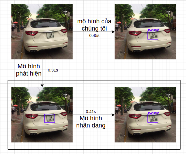 Đặt vấn đề: Hiện nay, ở Việt Nam, việc áp dụng các thiết bị máy quay trên các đường cao tốc, đường phố để phát hiện các lỗi vi phạm và phạt nguội các tài xế thông qua việc nhận dạng biển số xe đang trở nên phổ biến. Tuy nhiên, do đòi hỏi tốc độ xử lí cao trên thiết bị đích nên các mô hình học sâu được áp dụng để giải quyết 2 bài toán tách biệt này gặp trở ngại rất lớn về thời gian. Hơn nữa, biển số xe ở Việt Nam hiện nay đang có cả biển 1 dòng và biển 2 dòng, vấn đề này gặp khó khăn trong các mô hình nhận dạng văn bản theo tuần tự từ trái sang phải, điều này chỉ giải quyết trong dữ liệu biển 1 dòng.