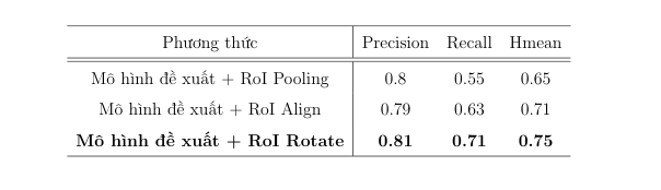 Việc ý tưởng đề xuất một mô hình thống nhất thay vì hai mô hình riêng biệt để xử lí từng tác vụ của bài toán phát hiện và nhận dạng là rất hay. Tuy nhiên để làm được điều này cần phải có cầu nối giữa chúng. Phương pháp lấy mẫu đã có từ lâu trong các mô hình về phát hiện đối tượng như Faster RCNN sử dụng phương pháp lấy mẫu Roi Pooling hay Mask RCNN đã sử dụng phương pháp lấy mẫu Roi Align. Để tạo ra một mô hình đầu cuối phát hiện và nhận dạng, hầu hết các phương thức trước đây đều áp dụng các loại lớp lấy mẫu khác nhau, như RoI Pooling, RoI Align, RoI Rotate đóng vai trò là cầu nối giữa nhánh phát hiện văn bản và nhánh nhận dạng văn bản. Trong phương pháp của chúng tôi, chúng tôi thử nghiệm với cả 3 phương pháp lấy mẫu trên, và kết quả của từng phương thức được chúng tôi thể hiện ở hình 9. Do dữ liệu của chúng tôi có sự đa dạng bao gồm dữ liệu ảnh có biển số xe cong, nghiêng và nhiều dòng, nên việc sử dụng phương pháp lấy mẫu RoI Rotate cho kết quả tốt nhất trong 3 phương pháp trên.